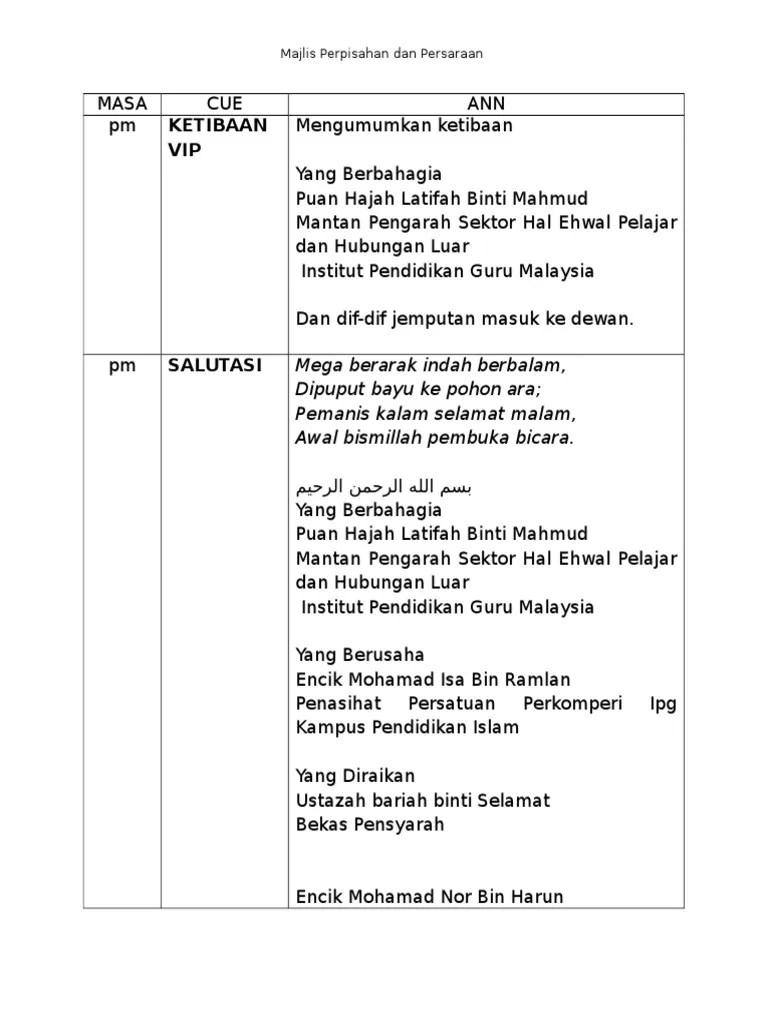 Teks mc majlis perpisahan guru (guru bertukar ke sekolah lain), bukan bersara. Seterusnya, majlis menjemput sherlyvia inta . Panduan penyediaan skrip bagi pengacara majlis perpisahan. Contoh teks pengacara majlis perpisahan murid tahun 6. Bisa untuk referensi para mc. Majlis perpisahan pensyarah teks pengerusi majlis aturcara teks sapaan catatan peringatan cue :